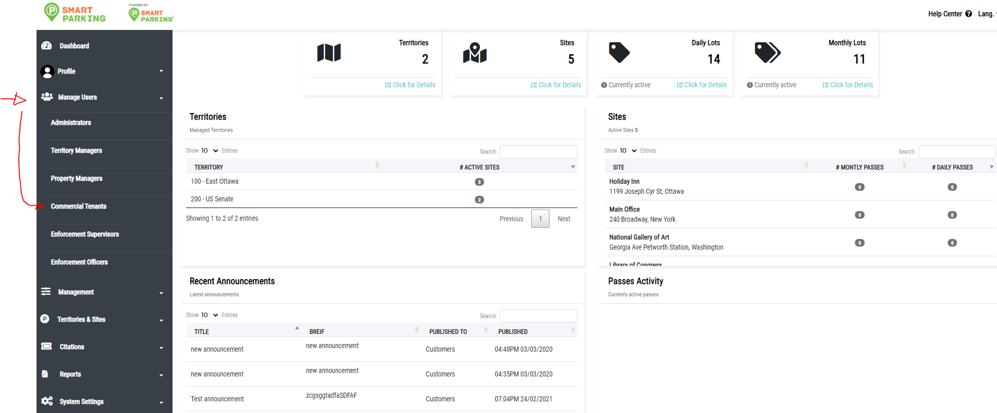 With Smart Parking Apps, you can let commercial tenants manage their own lots. This is usually the case in Retail Plazas and shopping strips when each store owner has the opportunity to manage either their own parking spaces or their designated employee parking. NOTE that in order to assign a lot to a commercial tenant, you must first have created that monthly lot in the correct site as you will need to link the commercial tenant with the lot.