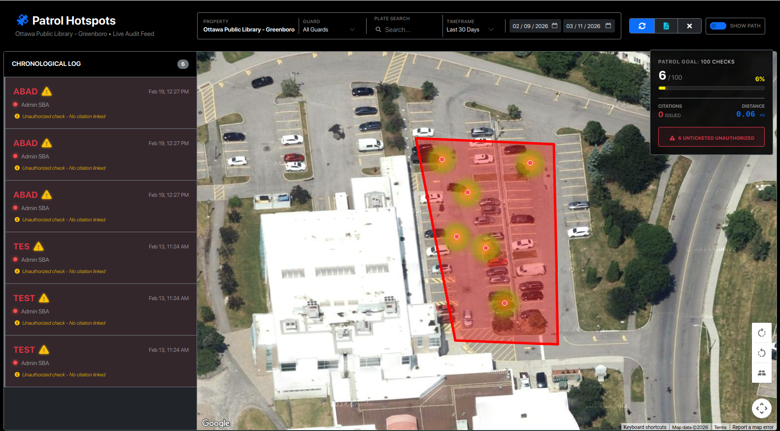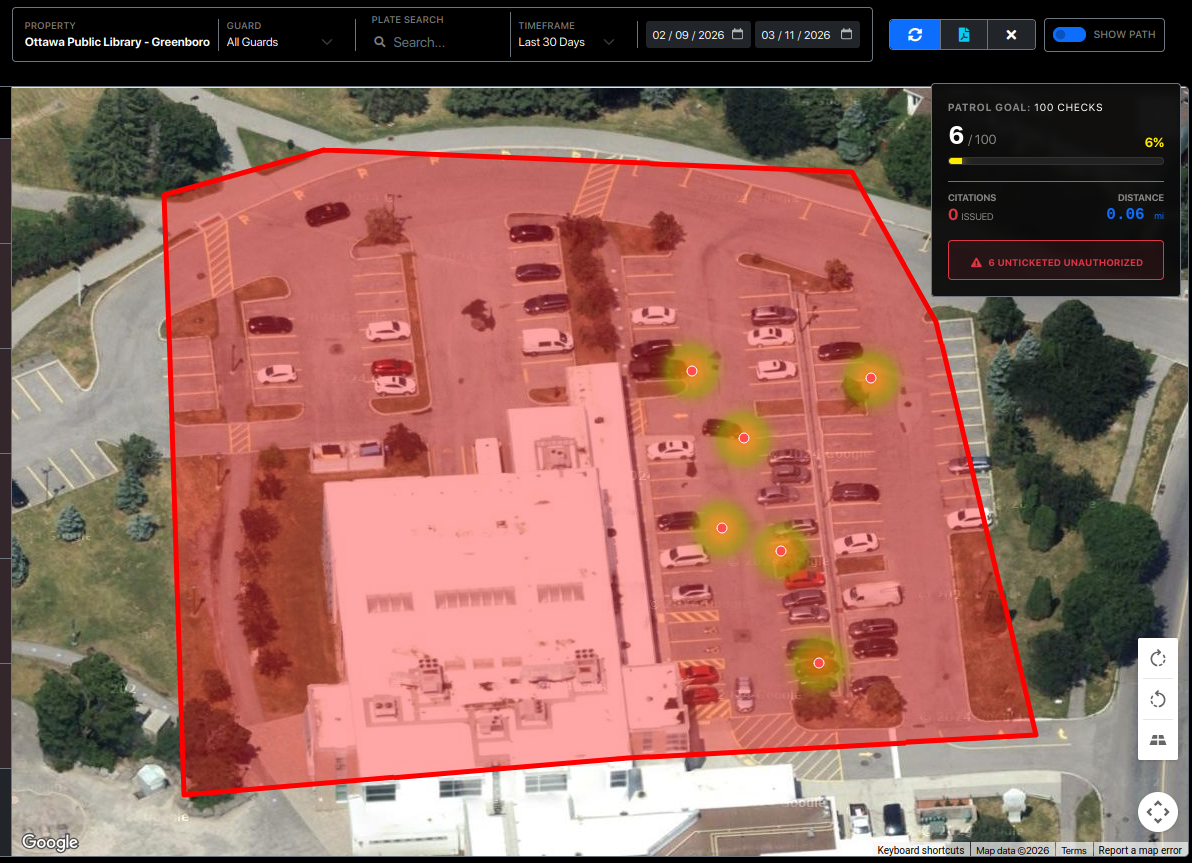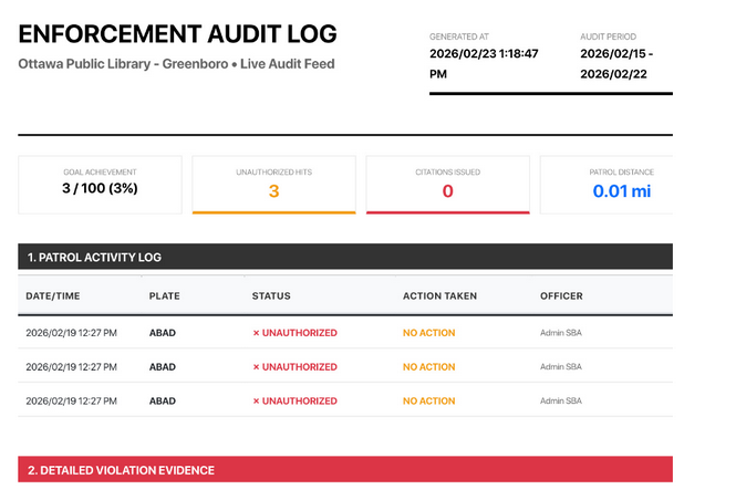 Intelligent Citation Linkage: > How it works: Our system uses a 30-minute "Smart Window" to correlate data. If a guard scans a vehicle and a citation is issued within 30 minutes of that scan, the system automatically links them. This ensures that the evidence photos and ticket details are perfectly synced with the patrol check, even if the paperwork was completed moments after the initial scan.